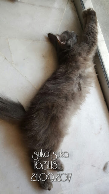 Dah kenyang dapat makan maka tidur lah abam.. tidur ala-ala beryoga.. musim panas masa ni ..kalau takada  aircond sibulus ni lagi kepanasan.. tapi disini memang tiada aircond.. nasib ko kucen.. kadang-kadang duk depan pintu bilik air.. orang tak nampak masing2 geledi, abam caca menyelinap masuk bilik air...